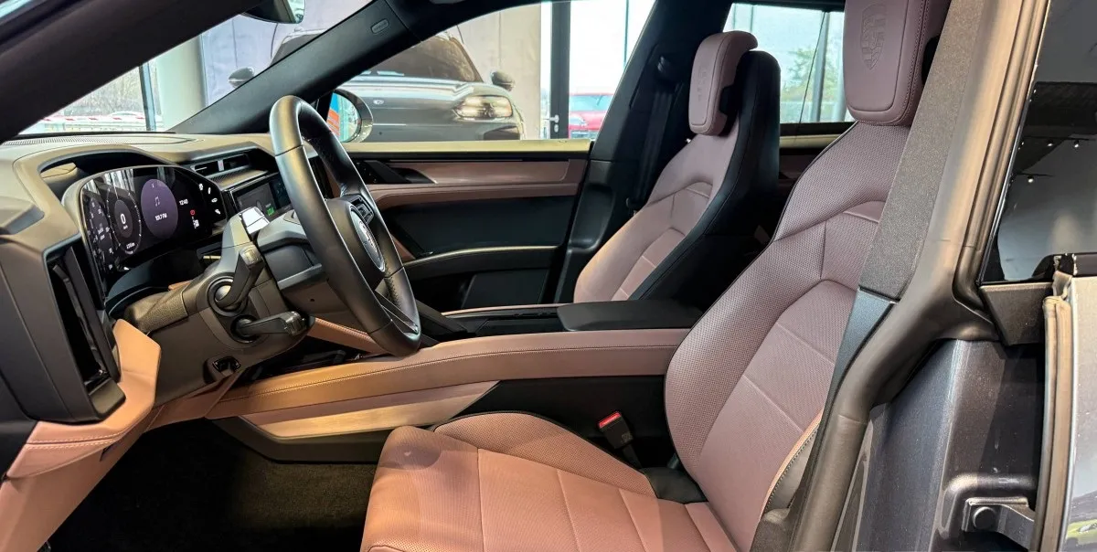 Elektrikli Cayenne’in içi tamamen değişmiş. Gösterge paneli dijital. Direksiyon arkasında sürücü dikkat sensörü bulunuyor. Orta konsolda büyük kavisli ekran var. Dokunmatik kullanım için deri destek alanı eklenmiş. Bu detay sürüş sırasında kontrolü kolaylaştırıyor.