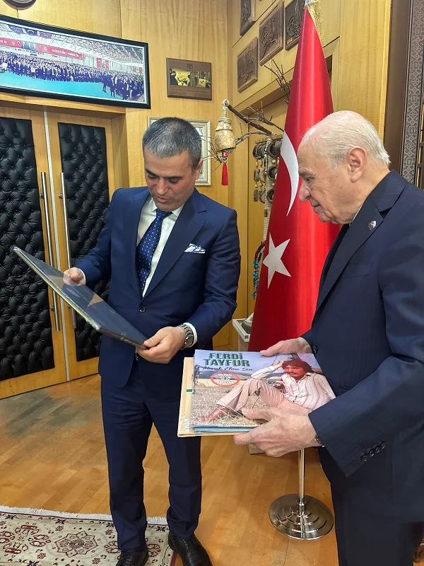 Bahçeli, ziyaretten dolayı memnuniyetini de dile getirdi. Demirören Medya TV Grup Başkanı Murat Yancı, MHP Genel Başkanı Devlet Bahçeli’ye Ferdi Tayfur’un nostaljik plakları ile Demirören Yayınları’nın seçkin eserleri arasında yer alan, “Sultan II. Abdülhamit Dönemi: Suriye” kitabını takdim etti.